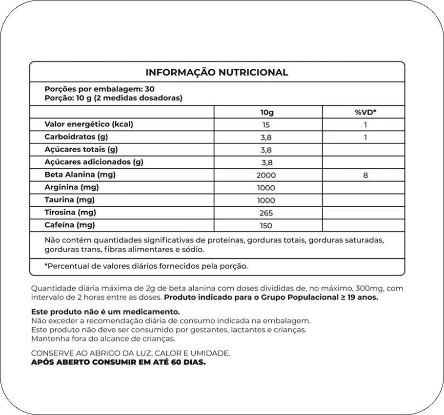 Quantidade diária máxima de 2g de beta alanina com doses divididas de, no máximo, 300mg com intervalo de 2 horas entre as doses. Produto indicado para o Grupo Populacional ≥ 19 anos.